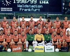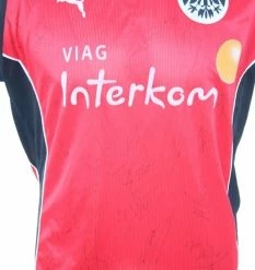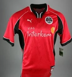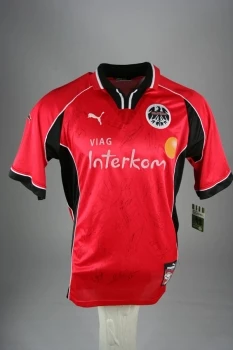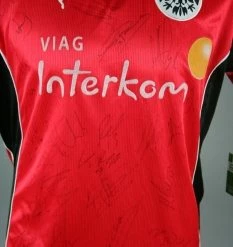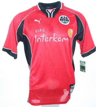 Puma Eintracht Frankfurt Trikot mit dem Brustsponsor Viag Interkom aus der Saison 1998-1999 in der Herrengröße XL.  Auf Wunsch mit original Beflockung von 1998/99 die aufwändig erstellt wird, geschnitten wird, angepasst wird und anschleßend auf ihr Trikot aufgebracht wird im Design von 1998-99. das Trikot ist vom gesamten Kader handsigniert.